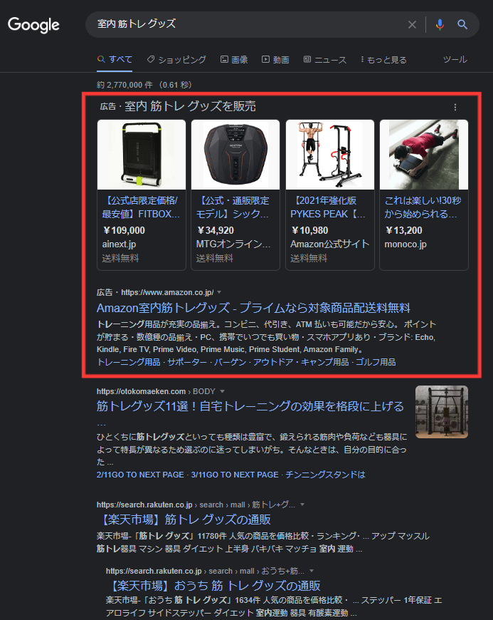 ユーザーが検索したキーワードに合わせて、検索結果に表示される広告のこと。