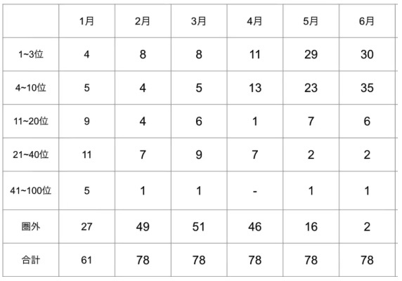 - 圏外記事:全体の約40%にあたる50本(検索エンジンからほとんど評価されていない)