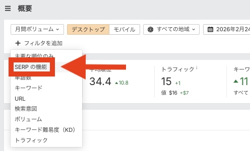 フィルタから「SERP機能」を選択し、次の選択肢で「AIによる概要」をクリックする。
