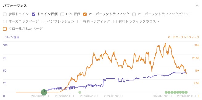 HERO’ZZ様と同じく、サイト立ち上げからコツコツと被リンクを増やしつづけたのですが、オーガニックトラフィックとの相関を見ると、サイト評価の土台とアクセスの伸びはそれなりに相関しているとわかります。