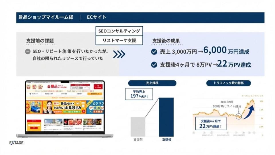 たとえば弊社EXTAGEでは、実際に支援したクライアント様の事例として行った施策や成果の数値まで具体的に公開しています。