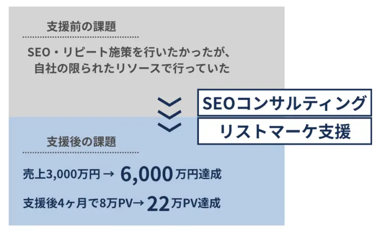 ブログ運営を含めたSEO施策全般を代行することでアクセスを大幅に伸ばし、売上を前年同月比で197%増という成果につなげることができました。