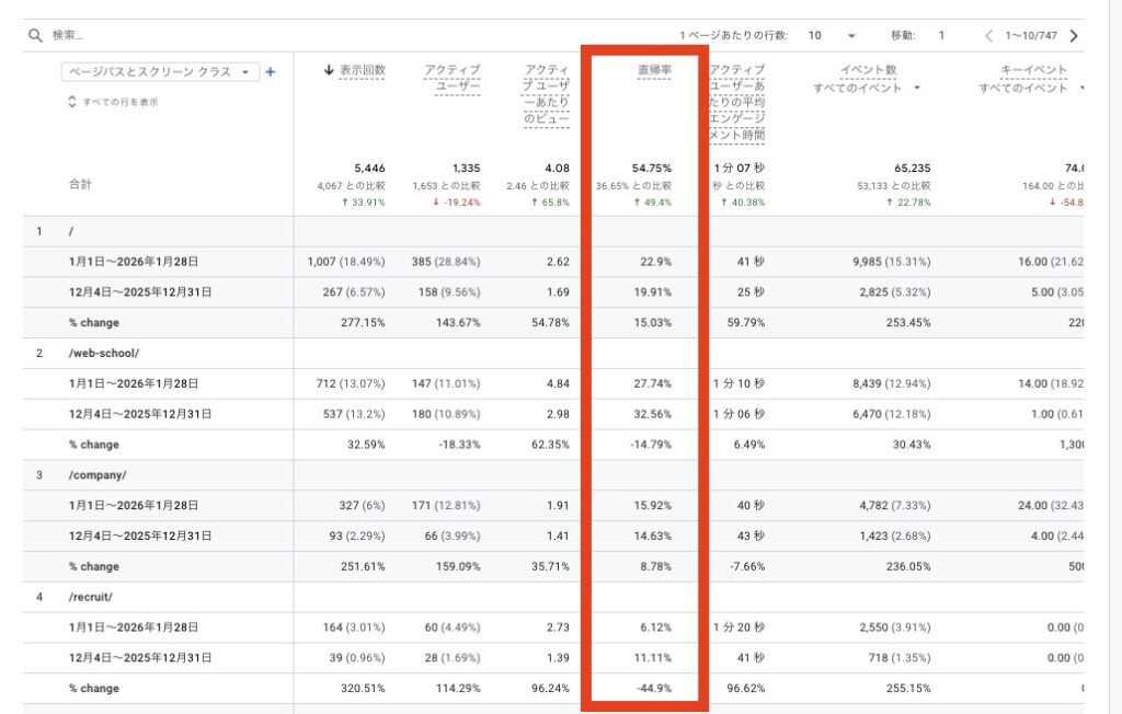 Googleアナリティクスの「レポート>エンゲージメント>ページパスとスクリーン」で主要なページを見て、直帰率が異様に高くないかを確認してみましょう。