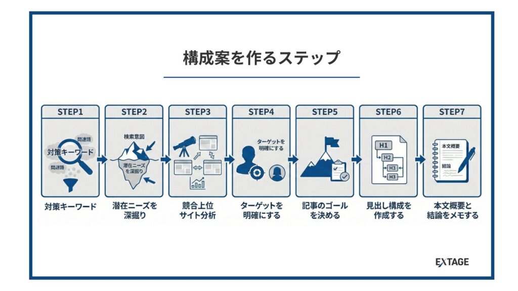 検索上位を達成するための記事構成案は、決まった手順に沿って作成できます。ここでは、プロが実践している作成フローを7つのステップに分解して解説します。