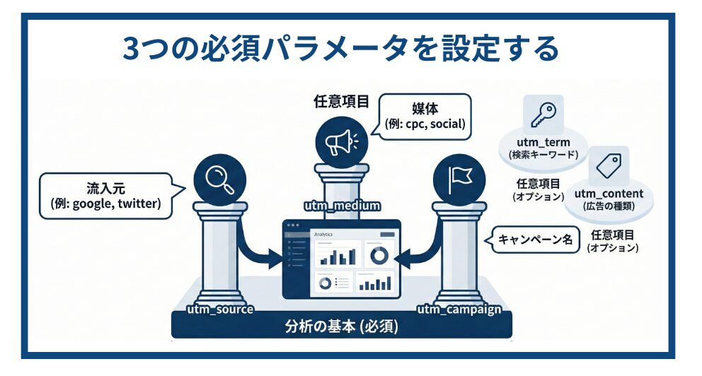 5種類のUTMパラメータのうち、分析の基本となるのは3つです。これらは必ず設定するようにしましょう。
