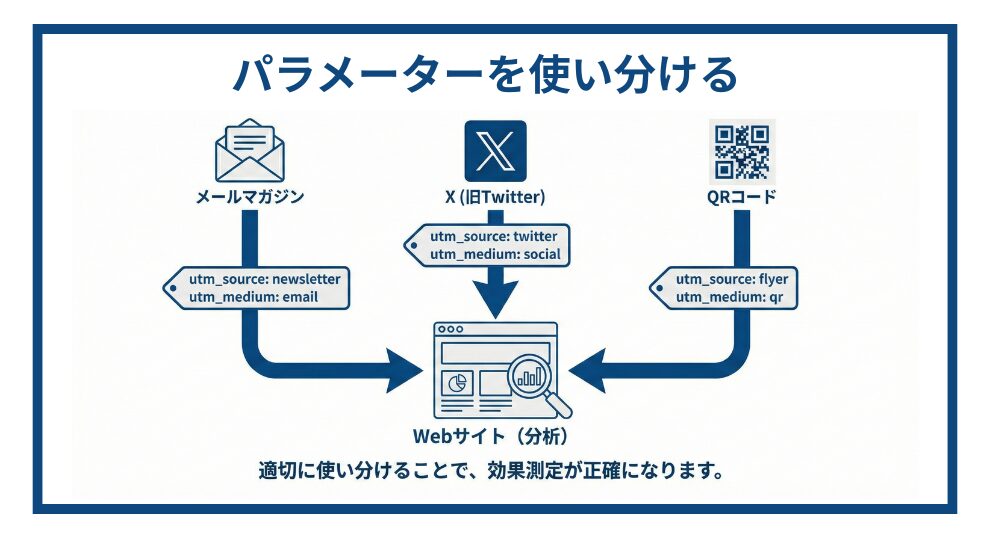 例えば、メールマガジンとX(旧Twitter)からの流入を区別したい場合、それぞれ異なる「utm_source」と「utm_medium」を設定します。