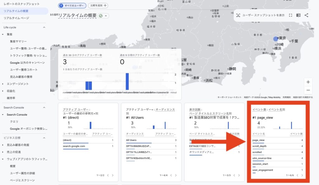 今すぐ確認したいなら、GA4のレポートからリアルタイムの概要をチェックしましょう。イベント欄で現在起きているイベントがわかります。