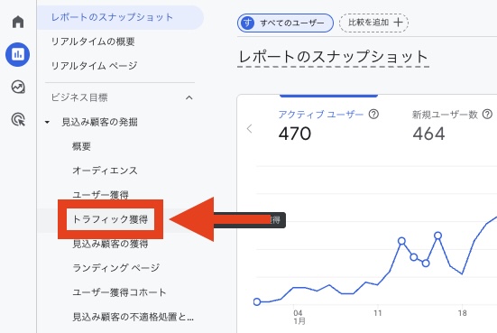 まずはこの「トラフィック獲得」レポートを開くことが、パラメータによる効果測定の第一歩です。