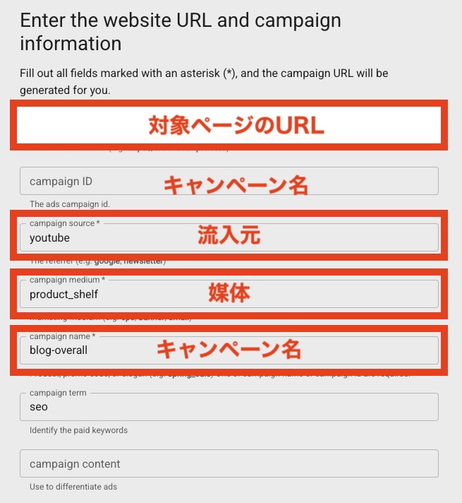 具体的には、WebサイトのURLや、utm_source、utm_mediumなどの各項目をフォームに沿って入力していくだけです。