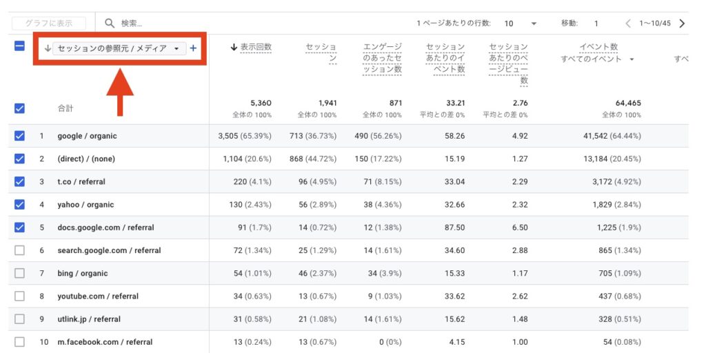 トラフィック獲得レポートをより詳細に分析するために、プライマリディメンションを「セッションの参照元 / メディア」に切り替えましょう。