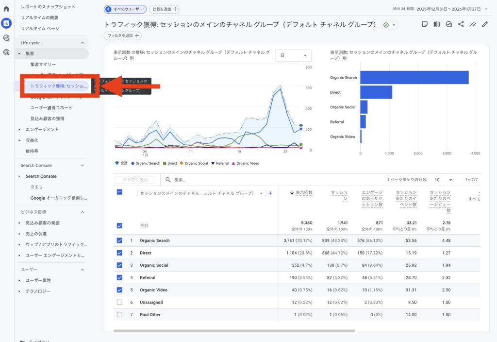 はじめに、最も基本的なレポートである「トラフィック獲得」レポートの確認方法から見ていきましょう。