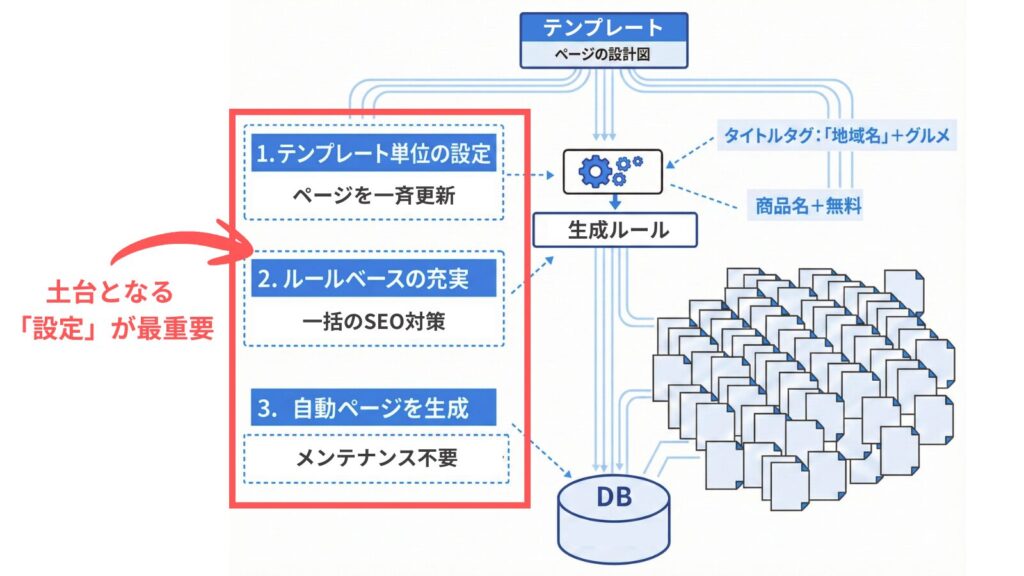 大規模サイトのSEOでは、ページの設計図である「テンプレート単位での改修」および、サイト全体の動きを制御する「ルールベースでの実装」がメインです。