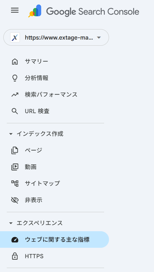 Google Search Console にログインします。左側のサイドメニューにある「エクスペリエンス」セクションを探し。その中にある「ウェブに関する主な指標」をクリックします。