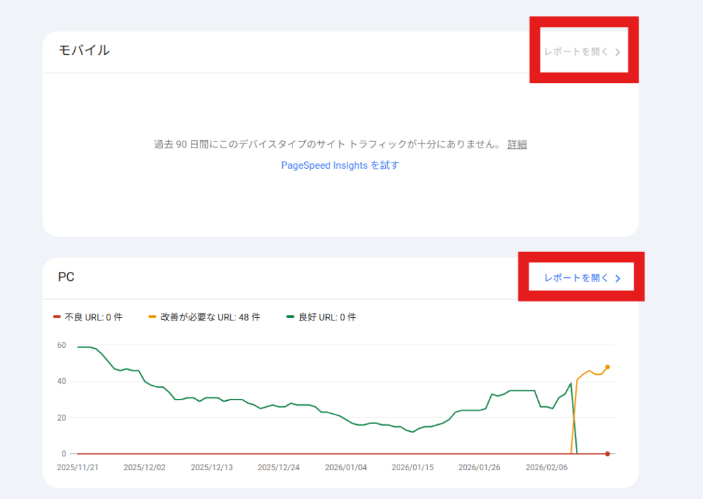 画面が開くと、「モバイル」と「PC」の2つのグラフが表示されます。調べたい方の「レポートを開く」をクリックします。