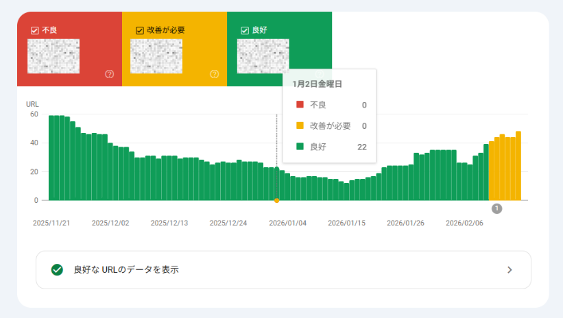 - 不良(赤色): すぐに改善が必要なレベル(LCPが4秒超など)
