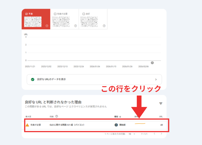 グラフの下にある「詳細」テーブルを見ると、「LCP の問題: 2.5秒 超(モバイル)」のように、具体的に何の指標が原因で評価が下がっているのかが表示されます。