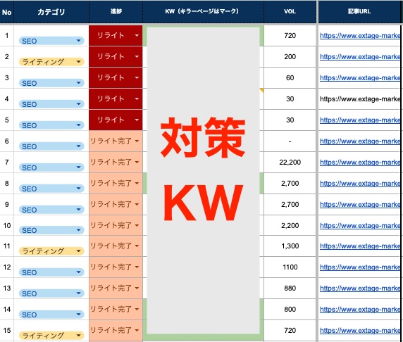 管理している記事の情報をスプレッドシートやエクセルなどにまとめます。最低限、対策キーワードとURLだけは必ず入れてください。