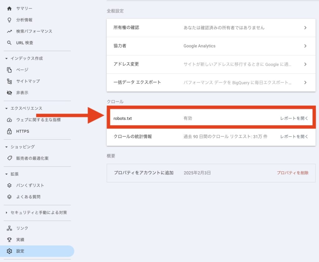 Googleサーチコンソールの「設定」から「robots.txtテスター」を開き、設定に誤りがないか確認しましょう。