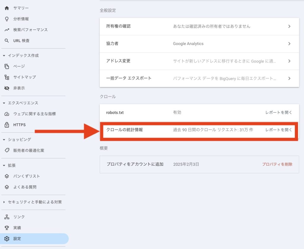 このレポートでは、1日あたりのクロールされたページ数や、サーバーの応答時間などを確認できます。