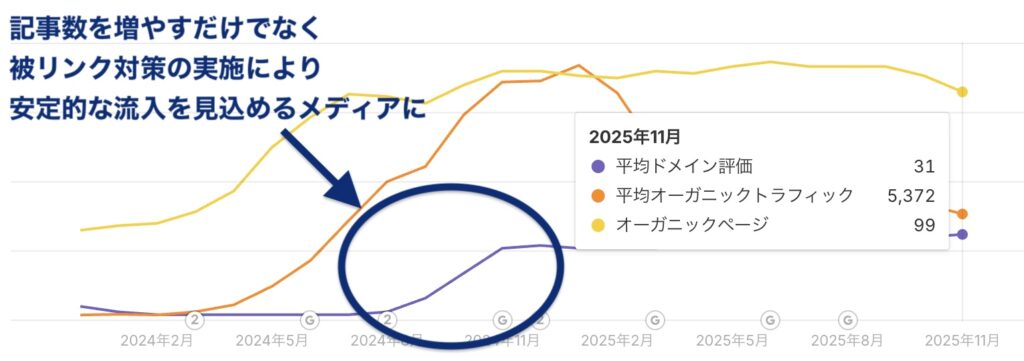 クライアント様が持っている知見・専門性を活かして、メディアの被リンク獲得を実施したことで、アップデートでも簡単には揺り動かされない基盤の強いブログメディアが確立されたことが大きいです。